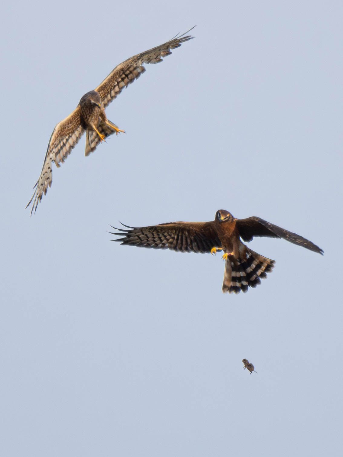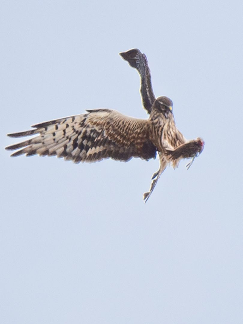 Normalerweise verläuft eine in der Luft stattfindende Beuteübergabe natürlich so wie es sein soll, schnell und reibungslos und das viele Male am Tag, abhängig u.a. davon, wieviele Jungvögel versorgt sein wollen und wie alt diese sind. Das Weibchen fängt dabei nicht nur Mäuse im Flug auf, sondern auch Kleinvögel aller Art und sogar Eidechsen. Zwar stehen auch Heuschrecken auf dem Speiseplan der Wiesenweihen, sie scheinen aber bei der Beuteübergabe in der Luft keine Rolle zu spielen. Hier sehen wir das Weibchen mit richtig fetter Beute, einem nicht näher zu identifizierenden Vogel, der nach der Übergabe erst einmal ausgiebig und wie mir schien, in großer Vorfreude auf den Leckerbissen begutachtet wurde.