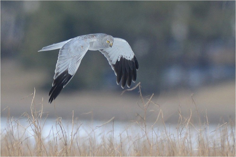 Kornweihen Männchen ähneln sehr der Wiesenweihe. Ihnen fehlt aber das schwarze Flügelband und der Bürzel ist auffallend weiß.