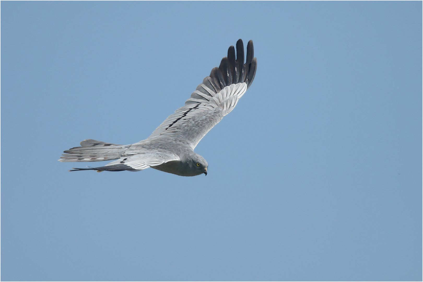Körper und Flügel sind hellgrau, die Flügelspitzen schwarz. Auf Unter- und Oberflügel kann man aus der Nähe ein schmales, schwarzes Band erkennen. Das unterscheidet das Wiesenweihe n-Männchen z.B. von dem Kornweihen-Männchen und ist somit ein wichtiges Merkmal.
